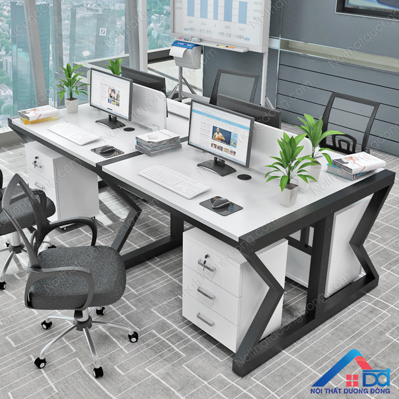 Cụm bàn làm việc 4 chỗ có cấu trúc đơn giản, chuyên nghiệp, đa năng dễ di chuyển, lắp đặt phù hợp với mọi không gian làm việc từ góc làm việc khiêm tốn về diện tích hay phòng ban trong doanh nghiệp lớn.